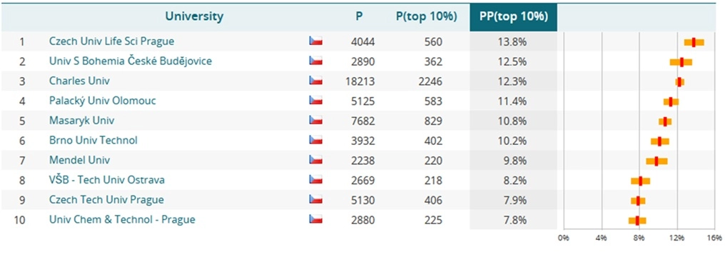 Leidenský žebříček přináší hodnocení výkonnosti zhruba 1500 univerzit po celém světě založené na vědeckých publikacích v databázi Web of Science. ČZU v tomto žebříčku, stejně jako v předchozím ročníku, obhajuje prvenství v desátém percentilu a nejlepší je také v oblasti Life and Earth Sciences. Pokud jde o celkové hodnocení kvality vědy, je třetí nejlepší v Česku za Jihočeskou univerzitou v Českých Budějovicích a Univerzitou Karlovou.