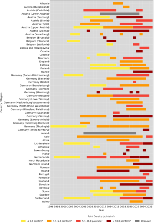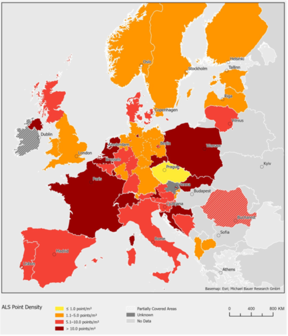 Z celkových 44 evropských zemí je letecké laserové skenování prováděno vládními institucemi nejméně ve 33 z nich. Typická bodová hustota dostupných dat se v Evropě pohybuje kolem 2–5 bodů na metr čtvereční, přičemž novější kampaně dosahují vyšších hustot, což zvyšuje jejich využitelnost pro mapování struktury vegetace. Většina evropských zemí poskytuje bodová mračna klasifikovaná alespoň do základních tříd, jako jsou terén, vegetace, budovy či vodní plochy. Podrobnější třídy, například elektrická vedení či mosty, jsou zahrnovány méně často. Většina zemí také poskytuje odvozené modely terénu, ale jen pár poskytuje odvozené charakteristiky vegetace. Přitom výběr použitých vegetačních charakteristik a metodika jejich výpočtu se může výrazně lišit. Aby bylo možné odvozené vegetační charakteristiky využít v celoevropském kontextu, je klíčové tyto aktivity koordinovat již od počátku tak, aby byl vytvořen jednotný harmonizovaný celoevropský produkt. Takový produkt by umožnil konzistentní interpretaci a využití dat napříč studiemi a zvýšil by spolehlivost a reprodukovatelnost výsledků při hodnocení vegetační struktury na velkých územních celcích. Pro realizaci takového celoevropského přístupu je zásadní vybudování centralizovaného datového úložiště, jednotného katalogu metadat a cílené doplnění dat v regionech, kde ALS dosud není k dispozici. Výzkum se uskutečnil v rámci mezinárodního projektu EarthBridge.