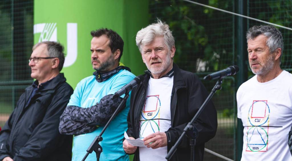 Při zahájení Sportovních her zaměstnanců ČZU 2025 spolu s děkany FŽP M. Komárkem a FAPPZ J. Soukupem (vlevo) a vedoucím Katedry tělesné výchovy D. Vavrlou (vpravo)