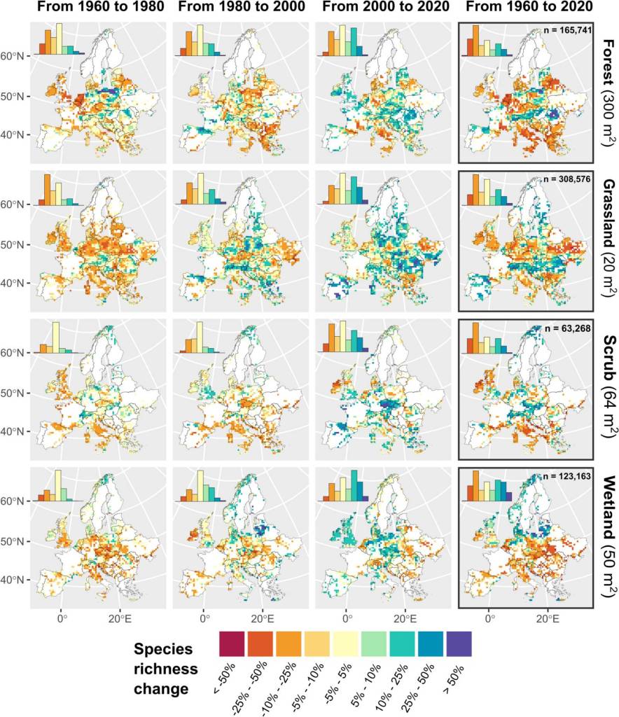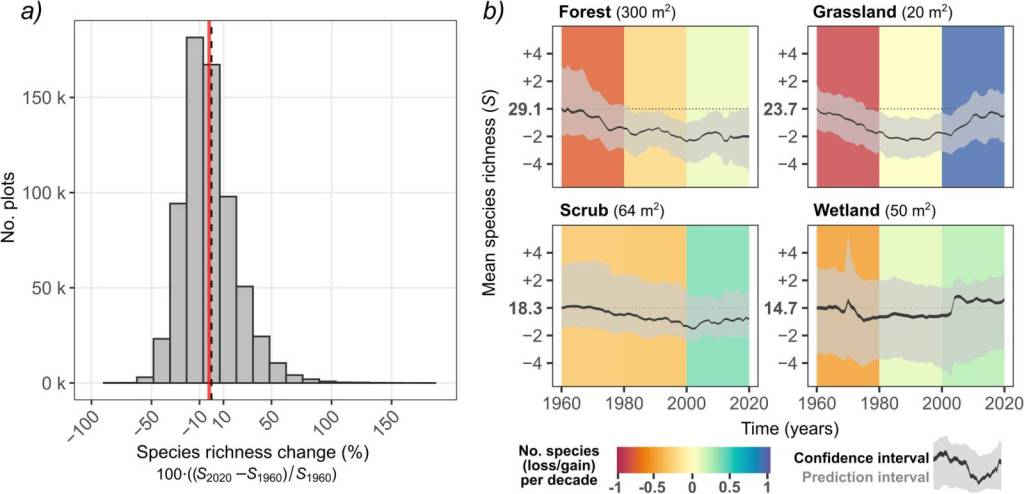 Výsledkem je téměř nulová čistá změna druhového bohatství mezi lety 1960 a 2020. Analýza napříč stanovišti ale odhalila zajímavý obecný trend v poklesu mezi lety 1960 a 1980, a následný nárůst počtu druhů mezi lety 2000 a 2020. Nárůst byl zaznamenán hlavně ve vyšších zeměpisných šířkách a nadmořských výškách, zatímco poklesy byly nejvýraznější v lesích.