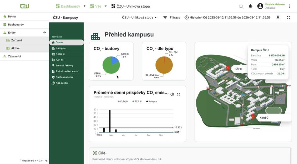 Součástí projektu je také systém IP kamer připojených přes 5G síť, které počítají průchod osob. Díky těmto datům lze uhlíkovou stopu přepočítávat na jednotlivé uživatele a zpřesnit tak hodnoty podle reálného využití budov. „Emise CO₂ jsou zobrazovány v různých časových intervalech a úrovních agregace, díky čemuž je možné analyzovat trendy v čase, porovnávat objekty mezi sebou a podporovat informovaná rozhodnutí v oblasti udržitelného provozu,“ dodává k metodice výpočtu Kopecký. Výsledky měření jsou prezentovány v přehledném dashboardu, který umožňuje sledovat aktuální stav i dlouhodobé trendy.